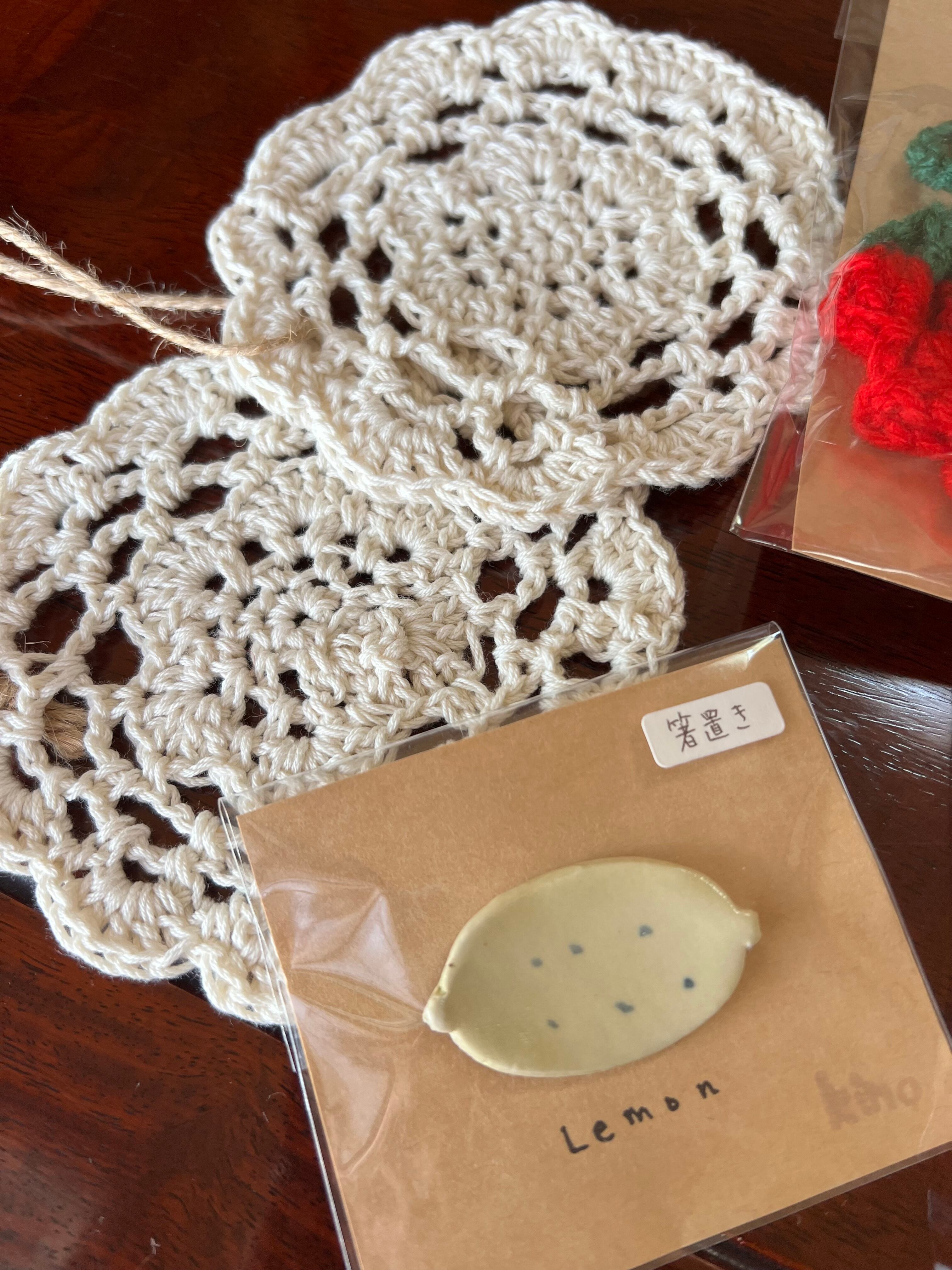 キッチンでの時間が ちょっと楽しくなるセット コースター2枚 アクリルたわし2つ (ふわりニット) 陶器の箸置き1つ (kino) 商品1400円+送料185円